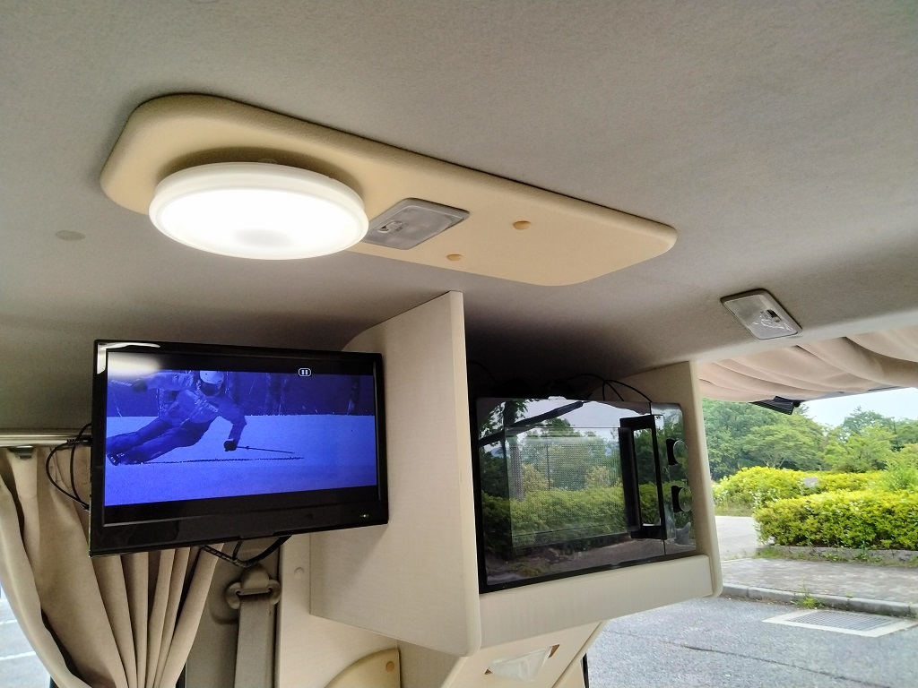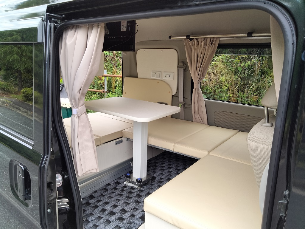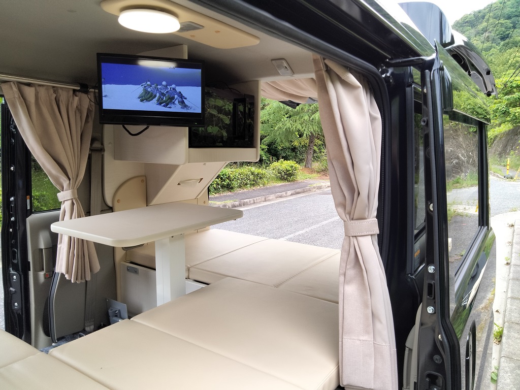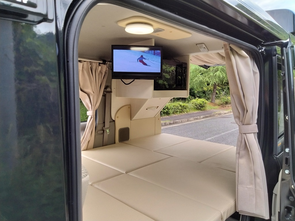 電気式クーラーボックスをソファーベッド下に収納し、100V電子レンジ、地デジ対応テレビはスチール製フレーム家具で上部にルーフ防音断熱材を取付100VLEDを配置しました。邪魔になるティッシュBOXを100V電子レンジ下のスペースに収納!飲食中のトラブル発生もお役に立てる場所です。また乗降りのための手すり(カーメイト製)を取り付けてありますので安全に乗降りできます。カーテンは遮光防炎処理をおこなったオーダーカーテンです、色柄ご自由にお選びいただけます。