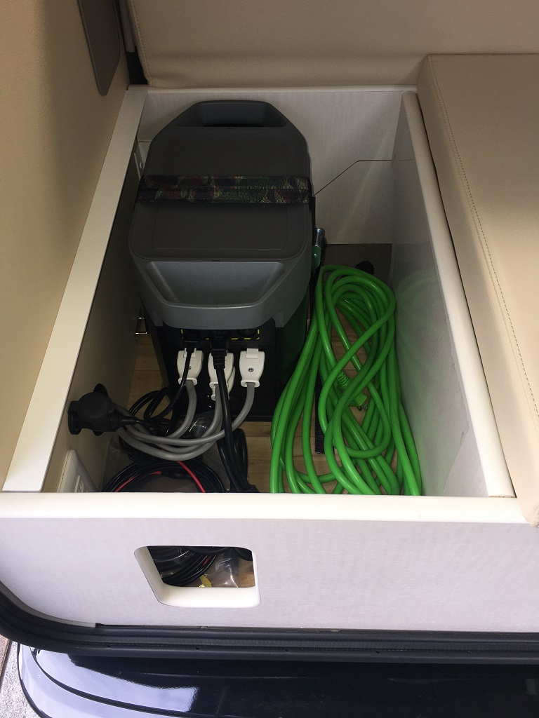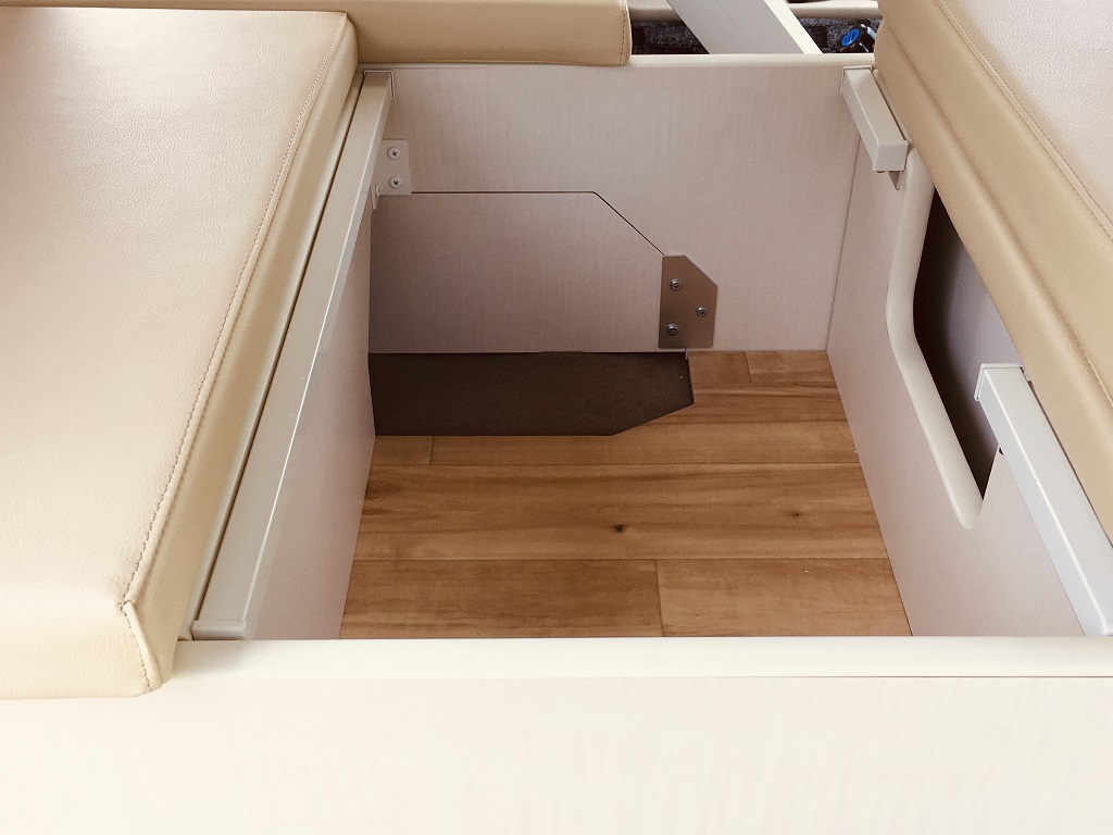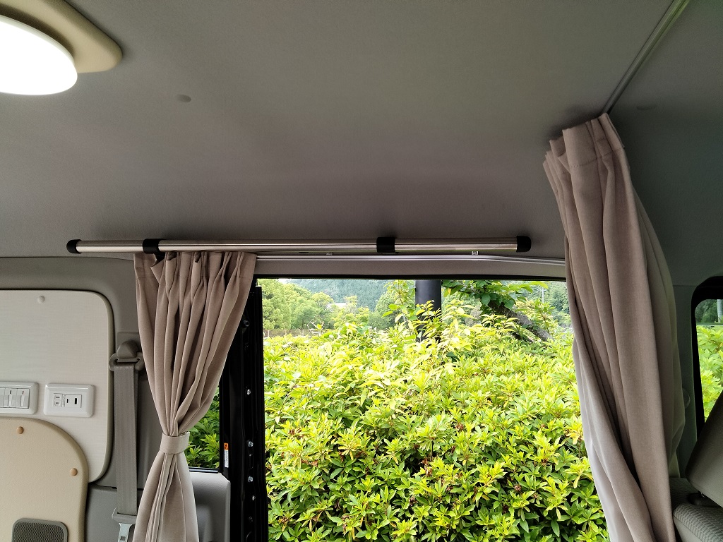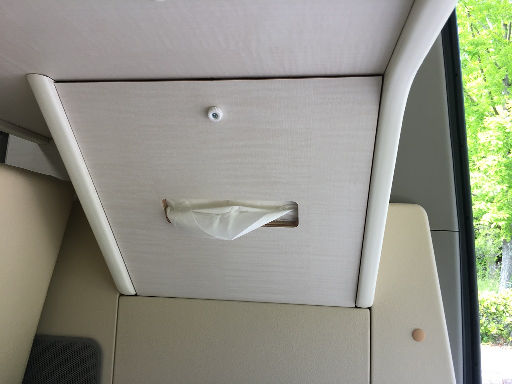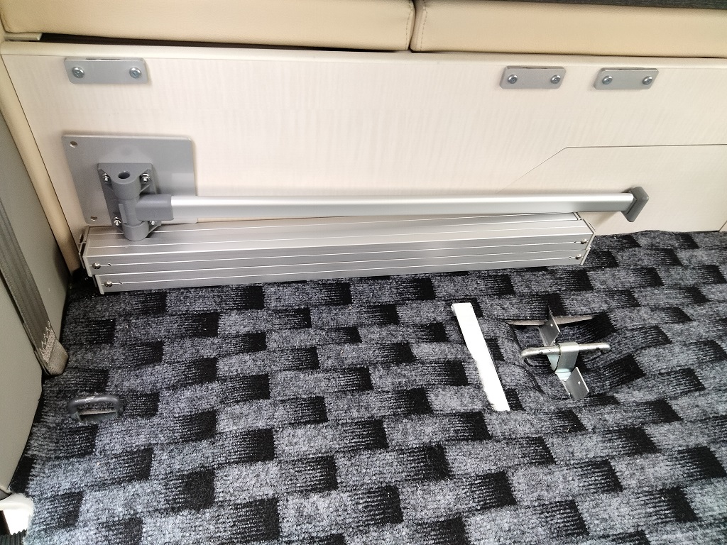 電気式クーラーボックスをソファーベッド下に収納し、100V電子レンジ、地デジ対応テレビはスチール製フレーム家具で上部にルーフ防音断熱材を取付100VLEDを配置しました。邪魔になるティッシュBOXを100V電子レンジ下のスペースに収納!飲食中のトラブル発生もお役に立てる場所です。また乗降りのための手すり(カーメイト製)を取り付けてありますので安全に乗降りできます。カーテンは遮光防炎処理をおこなったオーダーカーテンです、色柄ご自由にお選びいただけます。