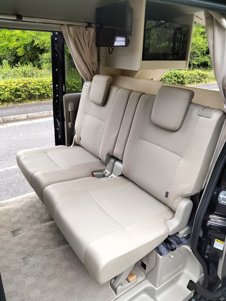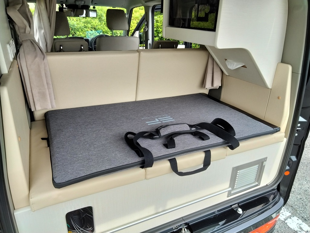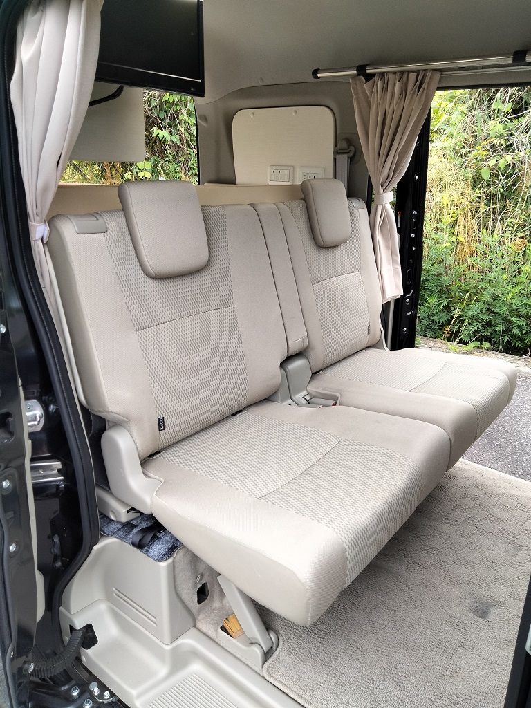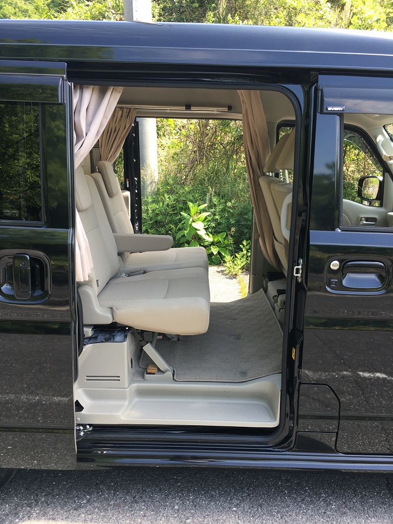 車中泊やキャンパー優先にすると、2名乗車しかできないとか、4名乗車にする為にベットの取外しで大変だったりと他社のエブリイワゴンキャンピングカーをよく目にしますが、このエブリイワゴンキャンパーは簡単に4人乗車ができます。4人乗車からベット展開も非常に簡単です。