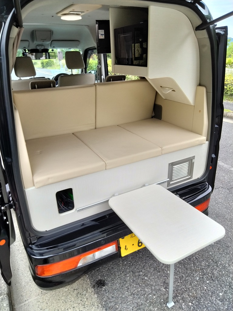コンセプト:軽車両という狭い空間を無駄なく有効に活用する、その中で大人2人と子供1名が広々とした空間で就寝できる。