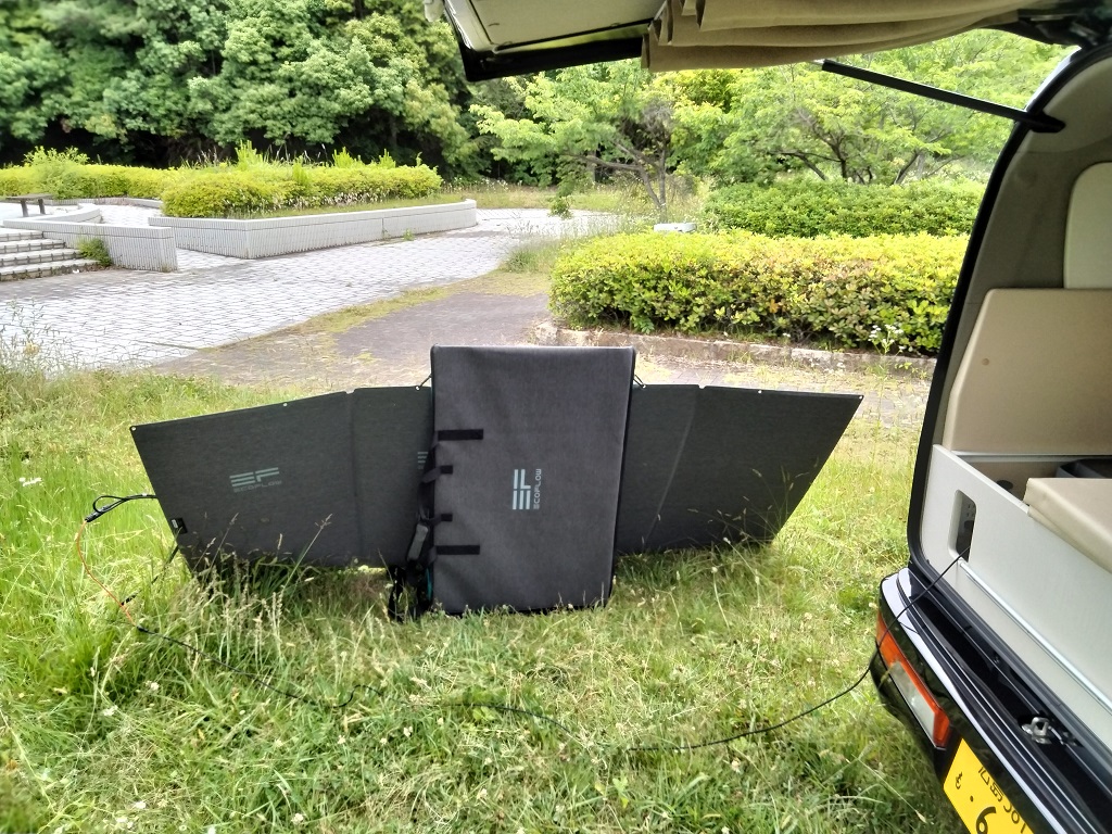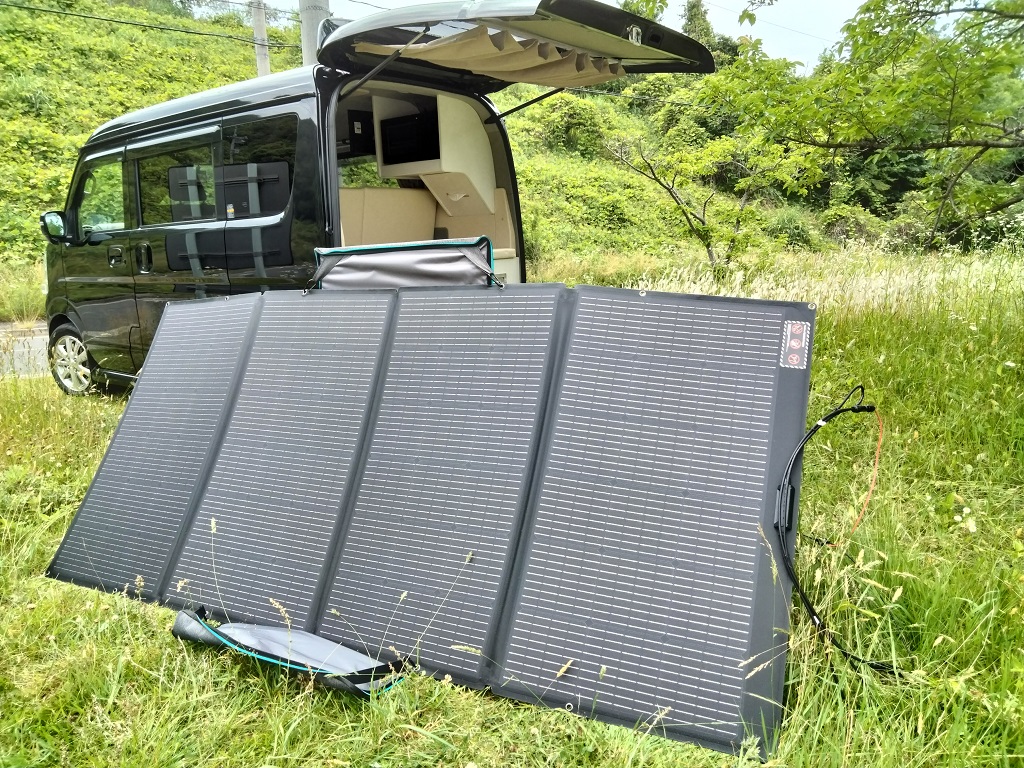 折りたたみ式ソーラーパネルシステムで100V電源がない場所でも充電可能です。