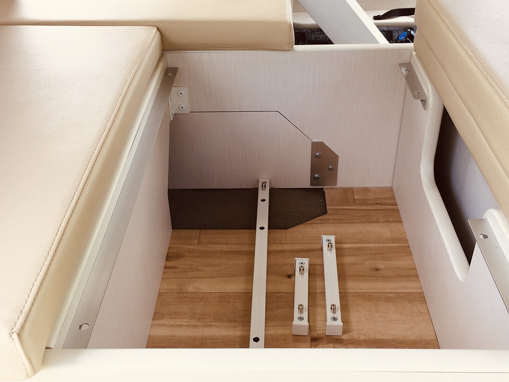 収納スペースからテーブルを取り出した後は、ソファーベッドが落ち込まないようにスペーサーで対応!