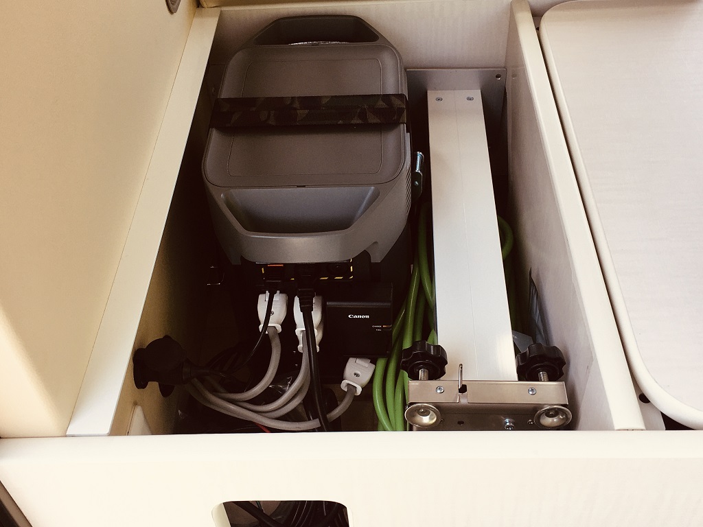テーブルは真ん中の収納スペース上に、室内用スタンドはポータブル電源横に室外用スタンドはセカンドシート後ろの隙間配置