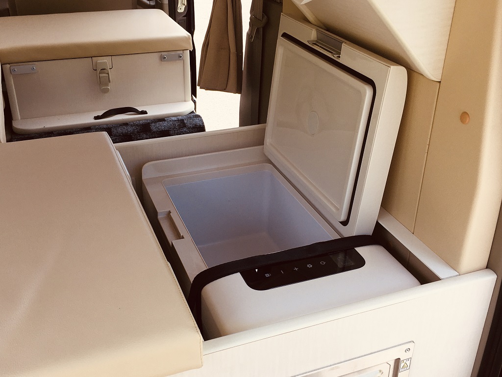 あぐらや正座、女の子座りだと長時間の飲食や会話で膝に負担がかかり疲れます。中間のソファーベッドを取り外しテーブルをセットすれば、大人3人が膝もらくらくで楽しい時間も長くすごせます。ソファーベッドの取り外しとテーブルのセットは簡単にできます。‐20℃まで冷やすことができる電気式クーラーボックスをソファーベッド右下に、その上部に100V家庭用電子レンジを配置しました。いつでも簡単に美味しい冷凍グルメを堪能しキンキンに冷えた飲み物で話しも盛り上がること間違いなし。電子レンジの下にテッシュボックスもありますよ!